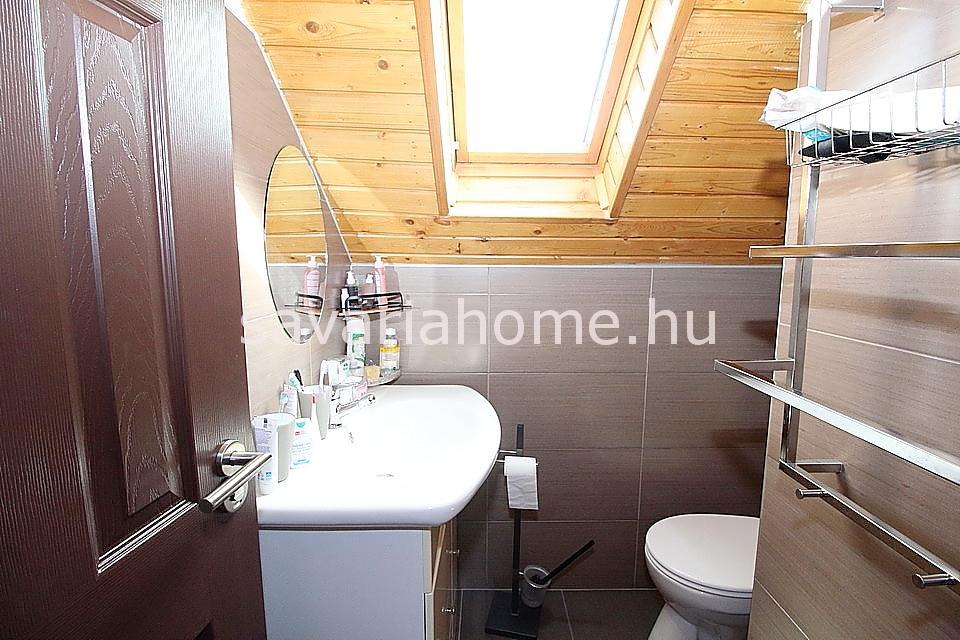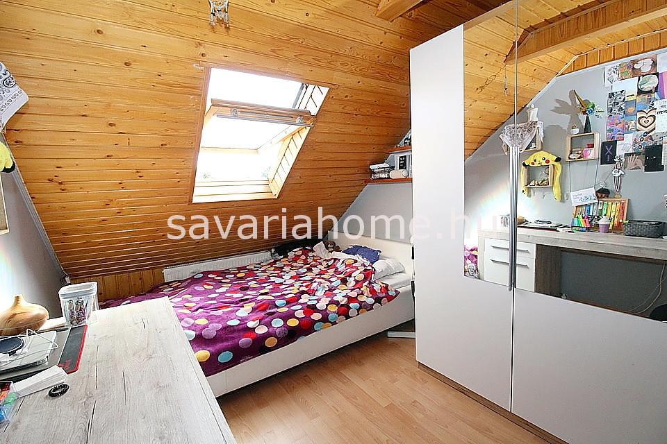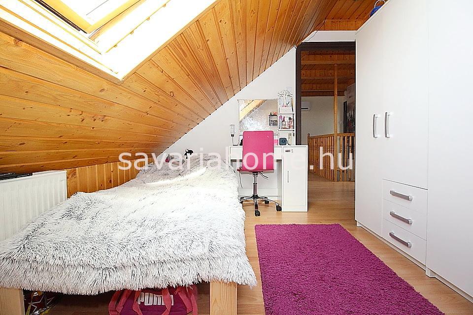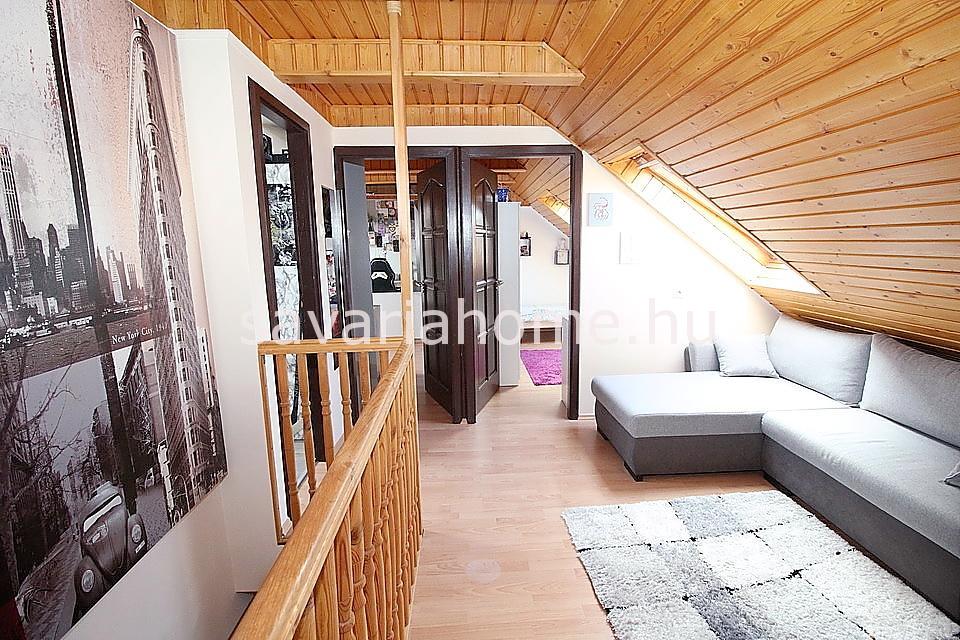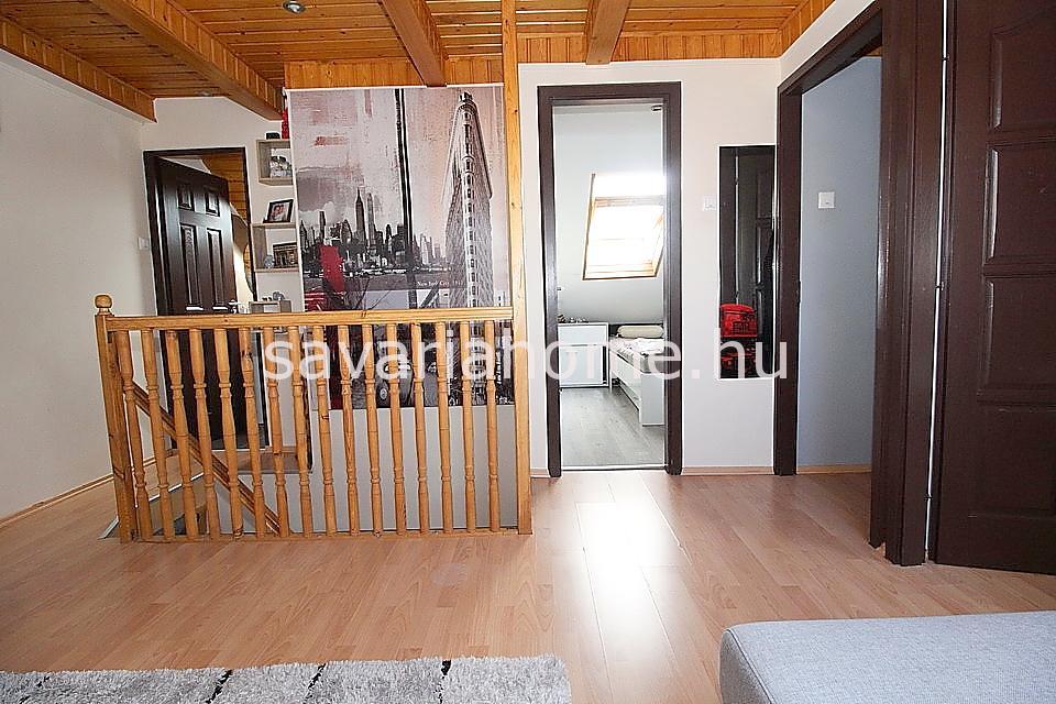 Az emeletre kényelmes belső lépcső vezet fel, ahol 3 hálószoba nyílik az emeleti nappaliból, és egy mellékhelyiség is megtalálható. A felette lévő tetőteret a tulajdonos tárolásra alkalmas helyiséggé alakította ki.